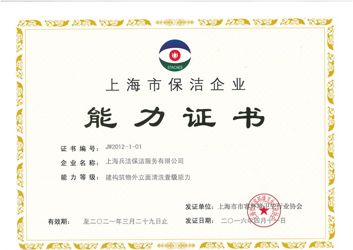 上海兵潔環(huán)境服務有限公司成立于2005年9月,專業(yè)從事外墻清洗、內(nèi)(外)墻粉刷、開荒清潔、石材翻新養(yǎng)護、外墻維修、地毯清洗,辦公樓、住宅樓、商場、工廠、賓館、醫(yī)院、展覽展示館等各類物業(yè)場所的日常保潔服務。公司現(xiàn)有員工1200余人,服務項目200多個,其中外墻清洗服務面積1500多萬平方米,日常保服務面積500多萬平方米。公司秉承“誠信務實、安全高效、吃苦耐勞、勤勉細致” 的企業(yè)作風和“專業(yè)來自敬業(yè),服務創(chuàng)造品質(zhì)”的基本理念,全面導入ISO9001:2008質(zhì)量管理體系認證證書,ISO14001:2004環(huán)境管理體系認證證書,OHSAS18001:2007